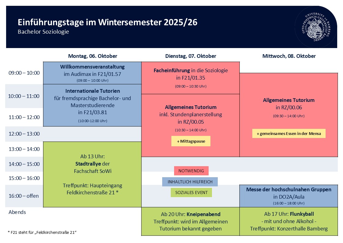 herzlich willkommen an der Uni Bamberg und am Institut für Soziologie! Dieser Kurs bietet im Rahmen der Erstsemestereinführungstage (EET) die Möglichkeit, den Studiengang Soziologie und die Uni schon einmal näher kennenzulernen. Dafür werden im Folgenden einige nützliche Infos zum Studienbeginn bereitgestellt:
