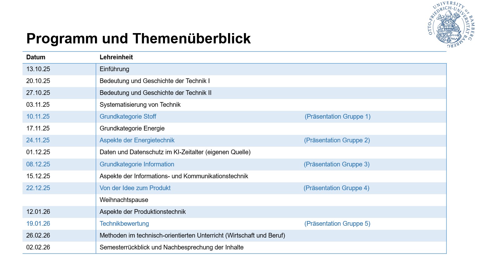 Bitte Seminarplan beachten! Das Skript bildet die Grundlage zur Bearbeitung der Aufgaben und Vorbereitung der Stundengestaltungen. Außerdem sollte man die Inhalte des VHB-Kurses "Grundlagen der Technik" begleitend nutzen.